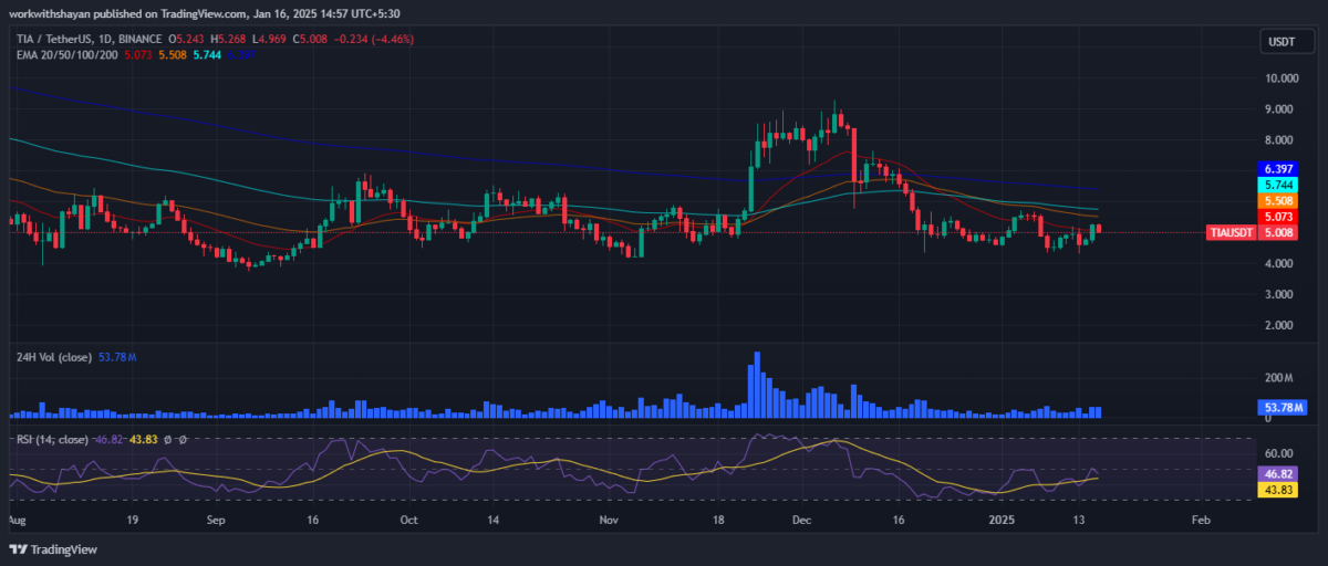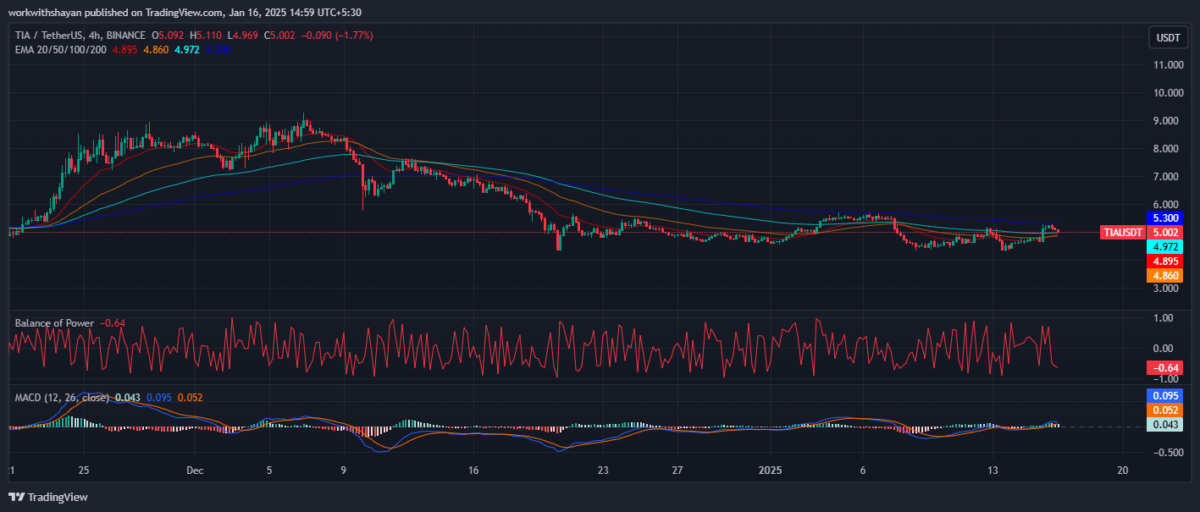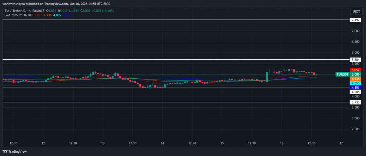 The TIA price analysis for 16 January confirms that TIA is witnessing bearish pressure around $5. Currently, buyers are aiming for a quick surge above immediate resistance channels.